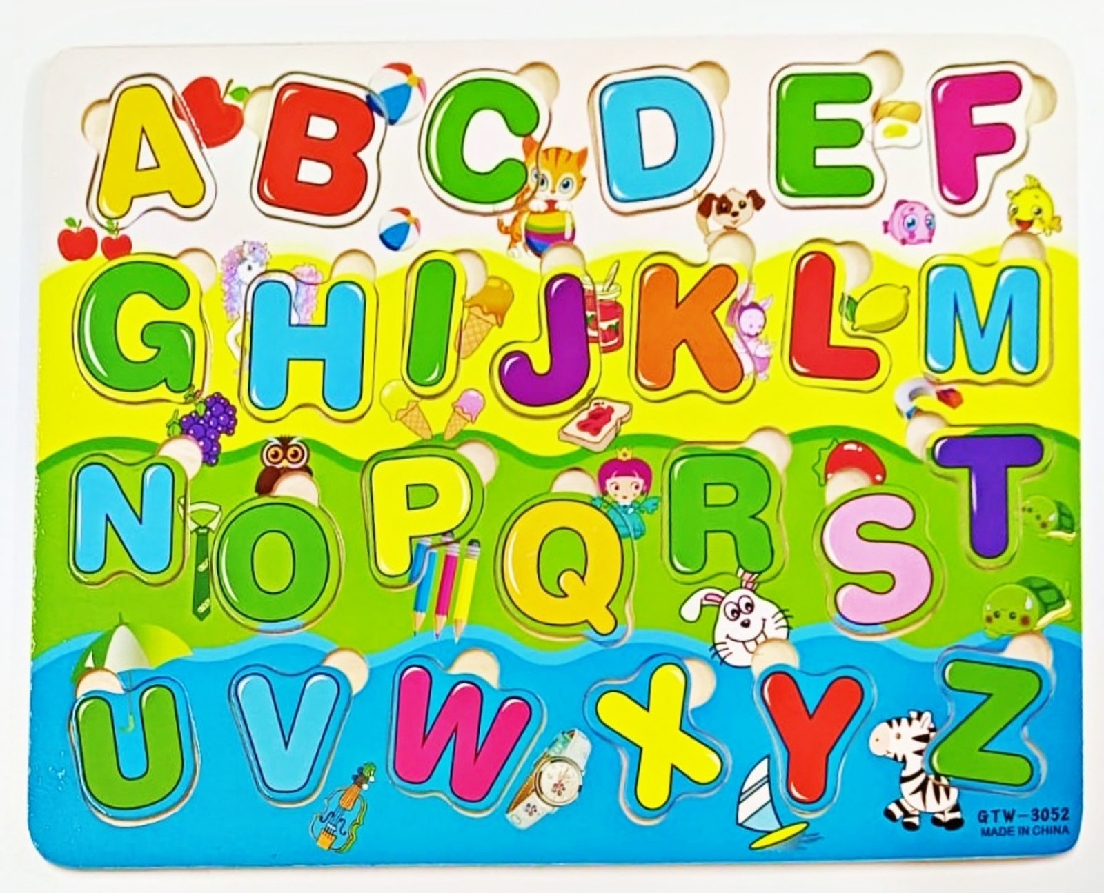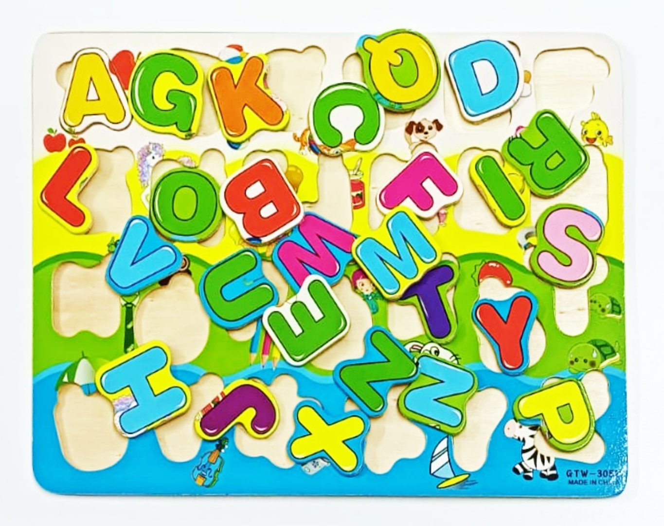 Wooden Alphabet board Capital Colorful base board with pictures 26 alphabet jigsaw puzzle pieces 26 images of objects corresponding to each alphabet